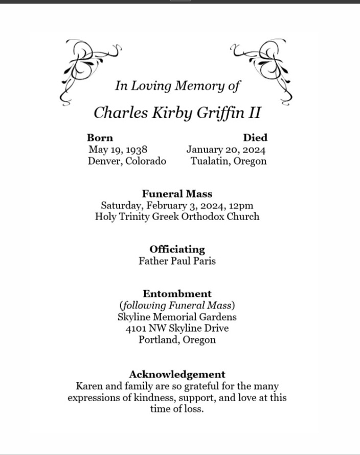 With thanks to Kirby's son Kerry Griffin for sending this copy of the funeral service information. It has been a great pleasure to have known Kirby and his family